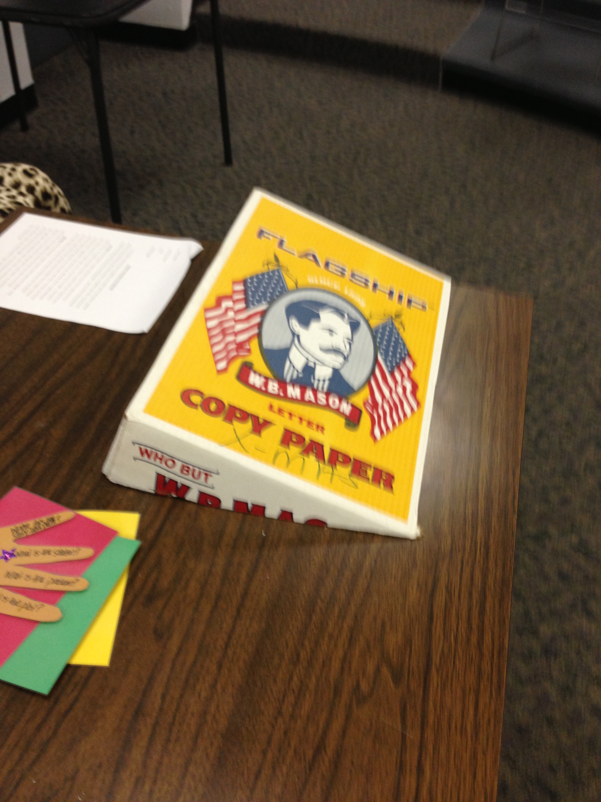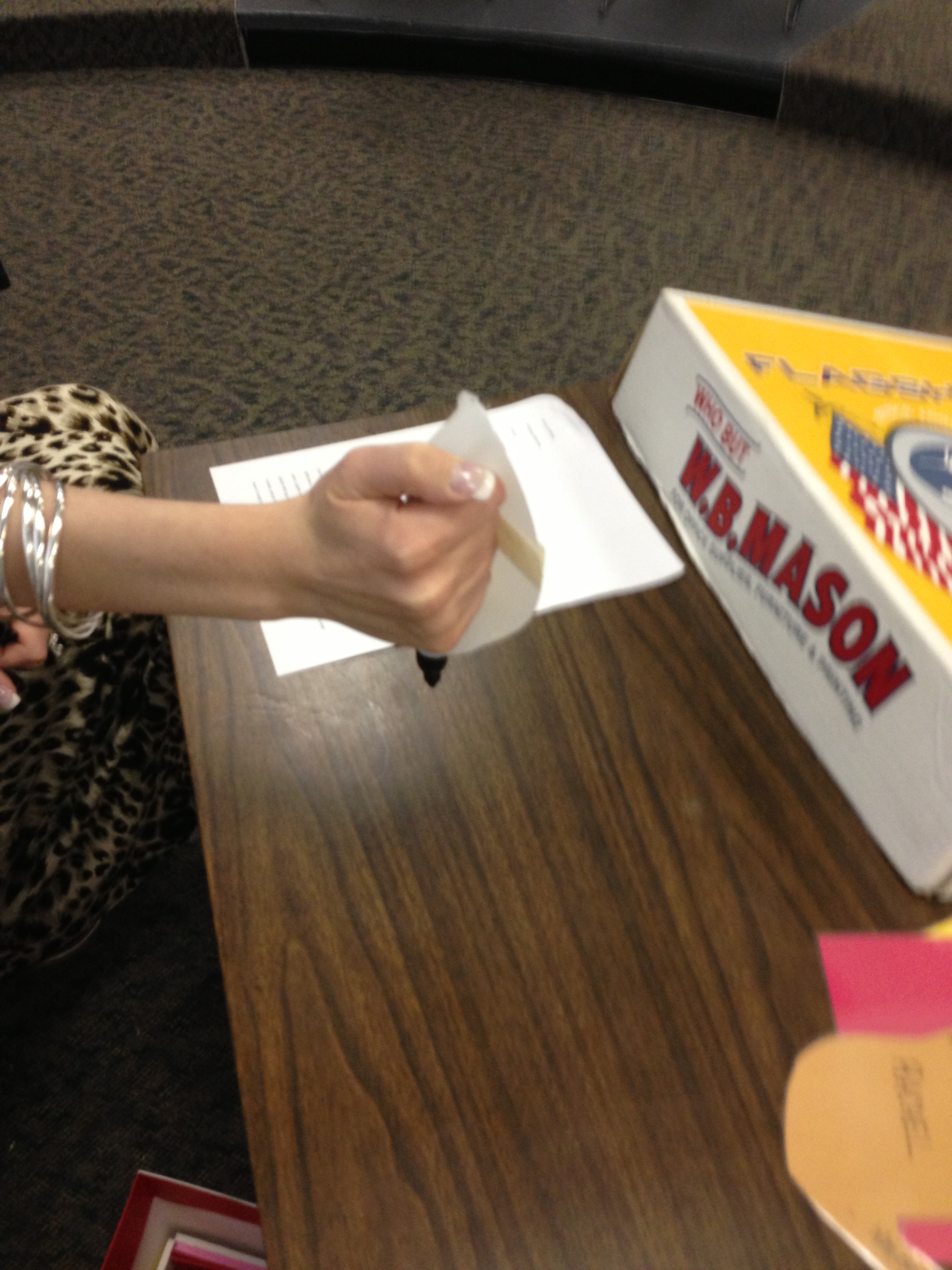 Cutout of hand used as writing prompt. Colored cards to place on desk to indicate student mood.