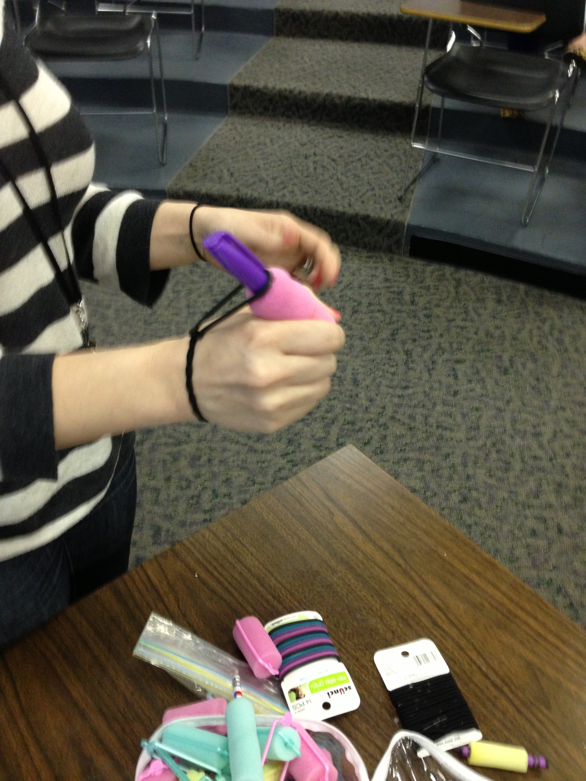 Pencil and pen grips made from foam hair rollers. Support from two hair ties.