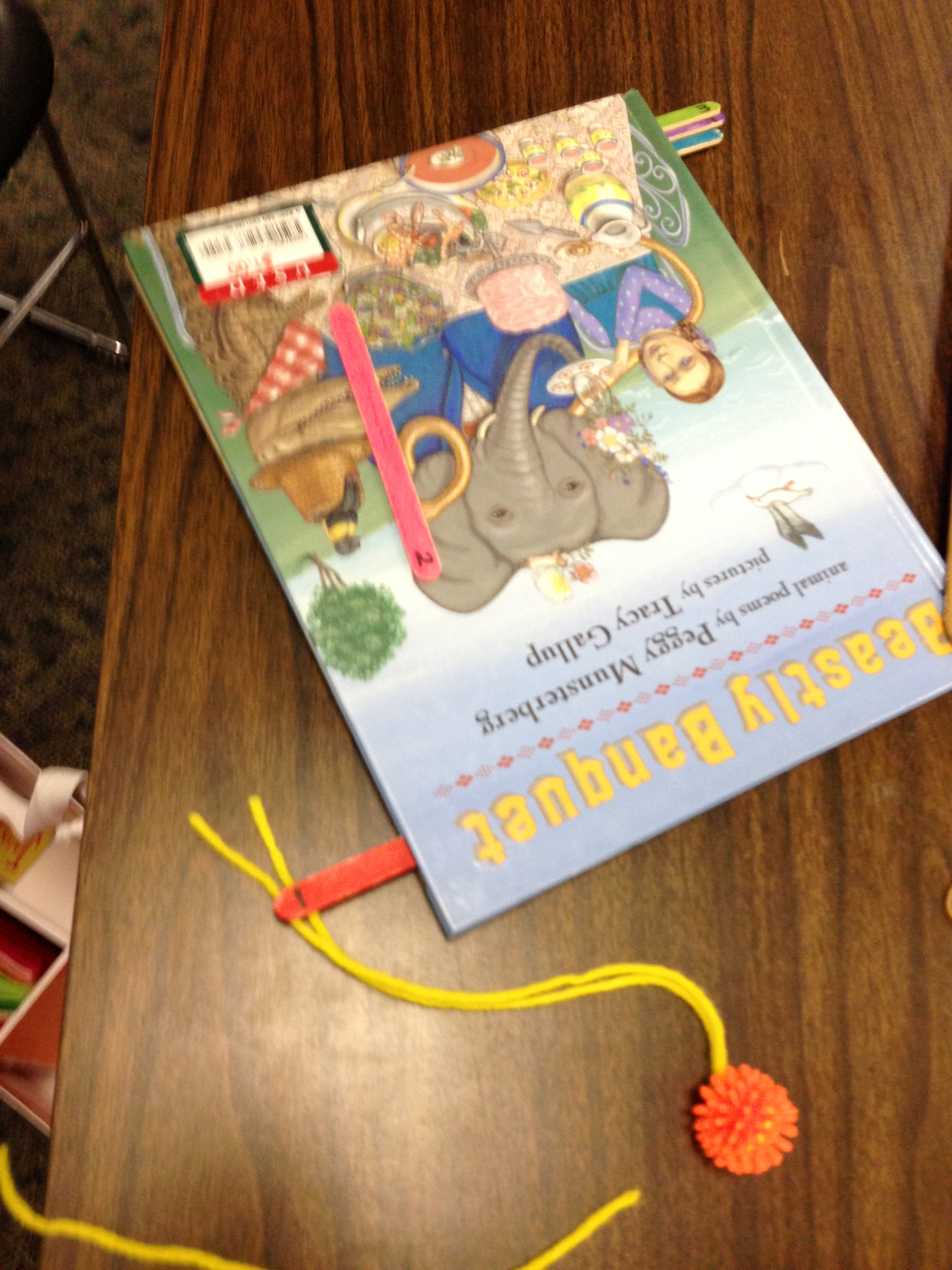 Popsicle sticks as numbered page flippers. Plus, small textured balls to facilitate grasp.